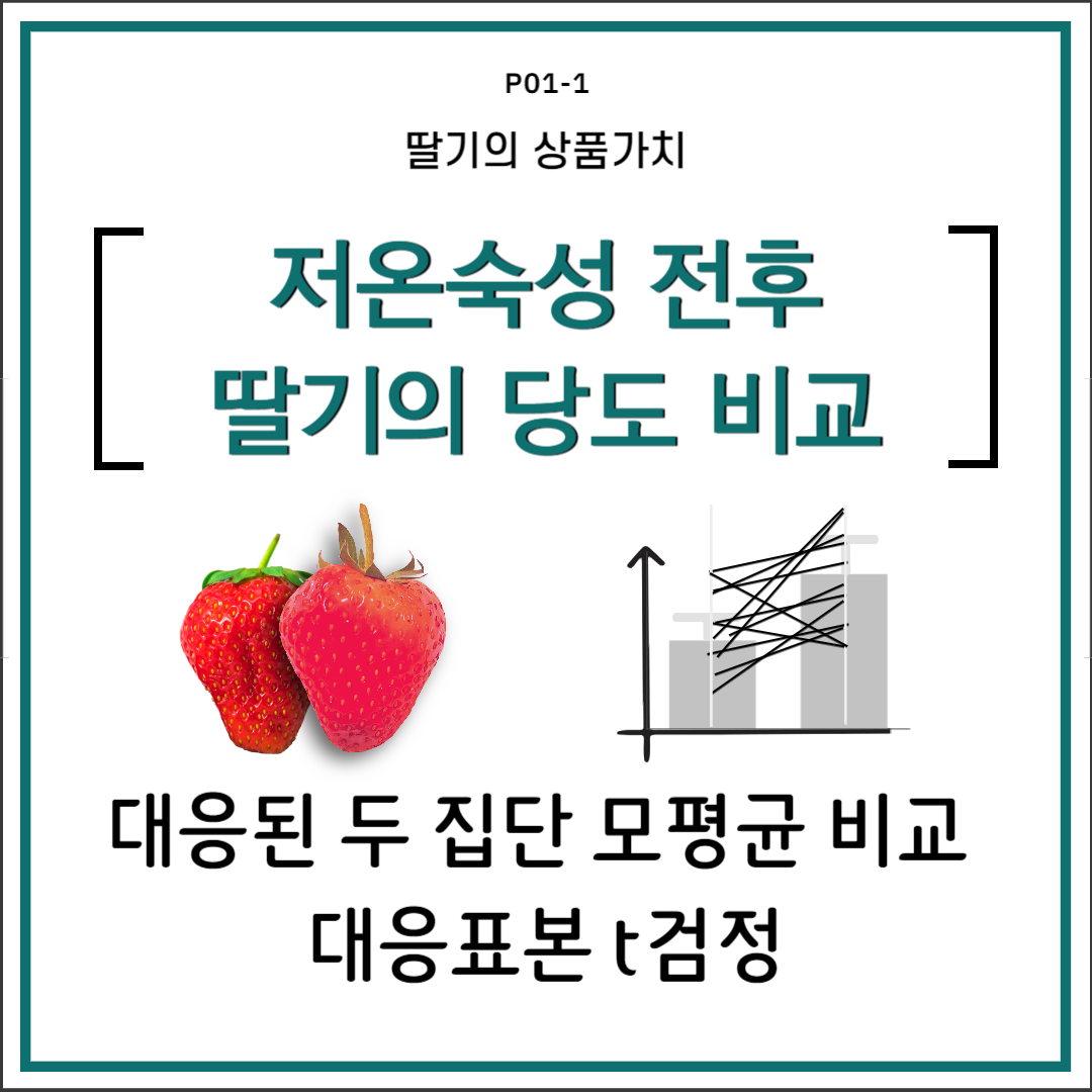딸기의 당도는 딸기의 상품가치 및 가격과 직결되는 중요한 변수이다. 저온숙성을 하면 딸기의 당도가 높아지는 지를 연구하였다. 당도를 확률변수로 하고 딸기 20개를 표본으로 하여 당도를 관측하였다. 저온숙성 전후 대응된 두 표본의 딸기 당도의 분포를 비교해서, ‘저온숙성을 하면 딸기 당도가 향상될 것이다’라는 연구가설을 검정하였다. 저온숙성 전후 당도 차이를 새로운 확률변수로 하여 대응표본 t검정으로 검정한 결과, 유의미한 차이를 보였다(p=0.001). 이번 연구를 통해 저온숙성을 하면 딸기 당도가 향상됨을 알게 되었다.