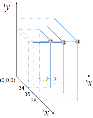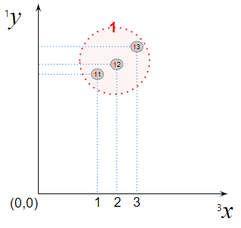 가상 딸기의 표본 모델을 위해 표본내의 집단과 각 집단의 크기를 정합니다. 표본내 첫번째 집단을 1이라고 하고 집단의 크기가 3이라 할 때 출하연속월수($^3 x$)와 당도($^1 y$)의 2차원 좌표계에서 딸기 데이터 포인트의 산점도의 예시는 다음과 같습니다.