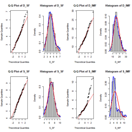설도의 전단력(S_SF)에 대한 Q-Q plot은 데이터 점들이 이론적 정규분포선을 따라 분포되어 있으며, 중심부에서는 정규성을 잘 따르는 것으로 나타났다. 다만, 꼬리 부분에서 약간의 이탈이 관찰되었는데 이는 통계 분석 시 발생할 수 있는 극단값으로 해석될 수 있다. 히스토그램에서는 실제 데이터의 밀도 곡선이 정규 분포 곡선과 잘 일치하며, S_SF의 데이터가 대체로 정규성을 만족함을 보여준다. 설도의 지방함량(S_IMF)의 Q-Q plot은 데이터 점들이 대각선에 맞춰져 있지만, 꼬리 부분에서 약간의 편차가 관찰되었다. 이는 일부 극단값이 영향을 미쳤을 가능성을 시사한다. 히스토그램에서는 중앙부의 밀도 곡선이 정규 분포 곡선과 비교적 유사하게 나타났지만, 양쪽 끝 부분에서는 다소의 차이가 확인되었다. 이는 S_IMF가 중심부에서는 정규성을 따르지만, 극단값으로 인해 완벽한 정규성을 충족하지 못할 수도 있음을 의미한다(Fig. 1).