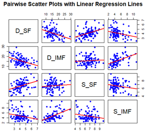 본 연구에서는 한우의 주요 형질 간 상관관계를 심도 있게 분석하기 위해 등심의 전단력(D_SF), 등심의 지방함량(D_IMF), 설도의 전단력(S_SF), 설도의 지방함량(S_IMF)에 대한 상관 분석과 회귀 분석을 수행하였다. 이 분석은 한우의 각 부위가 가지는 특성을 보다 정확히 이해하고, 고기 품질 평가 및 개선에 기초 자료를 제공하고자 한다.