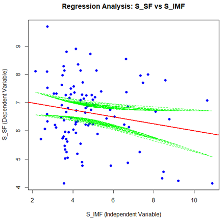 본 연구에서는 한우의 설도 전단력(S_SF)을 종속 변수로, 설도의 지방 함량(S_IMF)을 독립 변수로 설정하여 회귀 분석을 수행하였다. 회귀 분석 결과는 표 4에 요약되어 있으며, 그 관계를 시각적으로 보여주는 산점도와 회귀선은 Fig 4에 제시되었다.