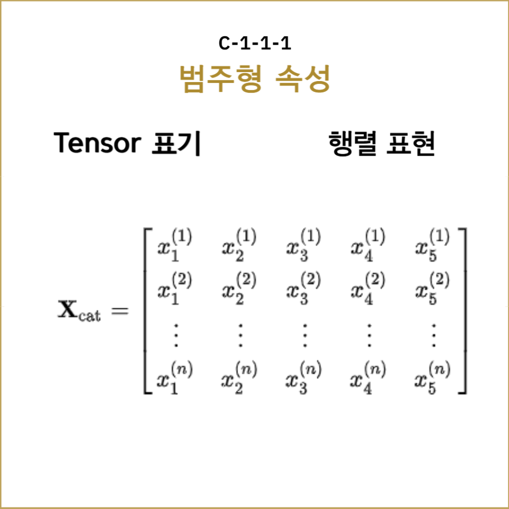 범주형 변수 $X$는 $k$개의 범주 $C_1, C_2, \ldots, C_k$로 구성된 데이터임. 이를 Tensor로 표현하면, 범주형 변수 $X$는 차원이 $d$인 벡터 $\mathbf{X}$로 정의됨.