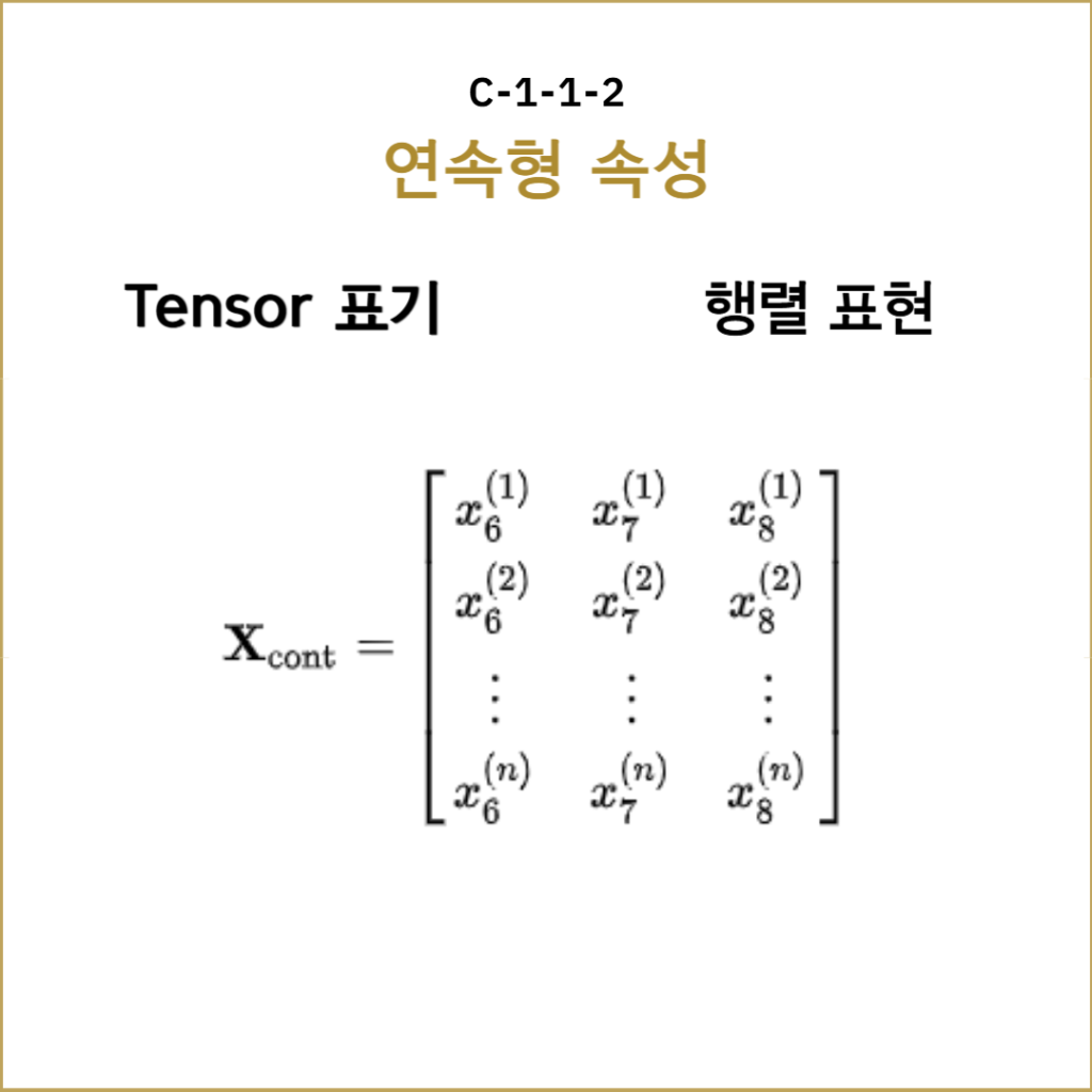 연속형 변수는 실수값 범위에서 정의되며, 행렬 $X$의 원소 $x_{ij}$는 다음으로 표현됨.