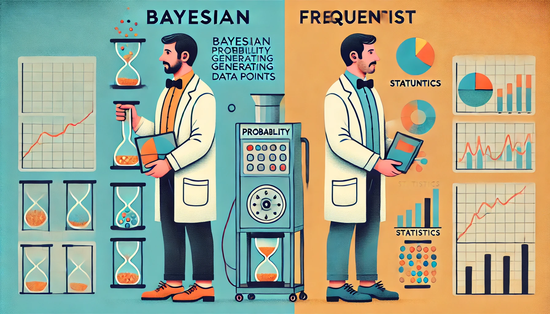 - Bayesian(베이지안, 사후확률추구자)은 베이지안 접근법을 따르는 사람입니다. 이들은 확률을 주관적인 믿음의 정도로 해석하며, 새로운 증거를 사용하여 사전확률(prior probability)을 사후확률(posterior probability)로 갱신합니다.