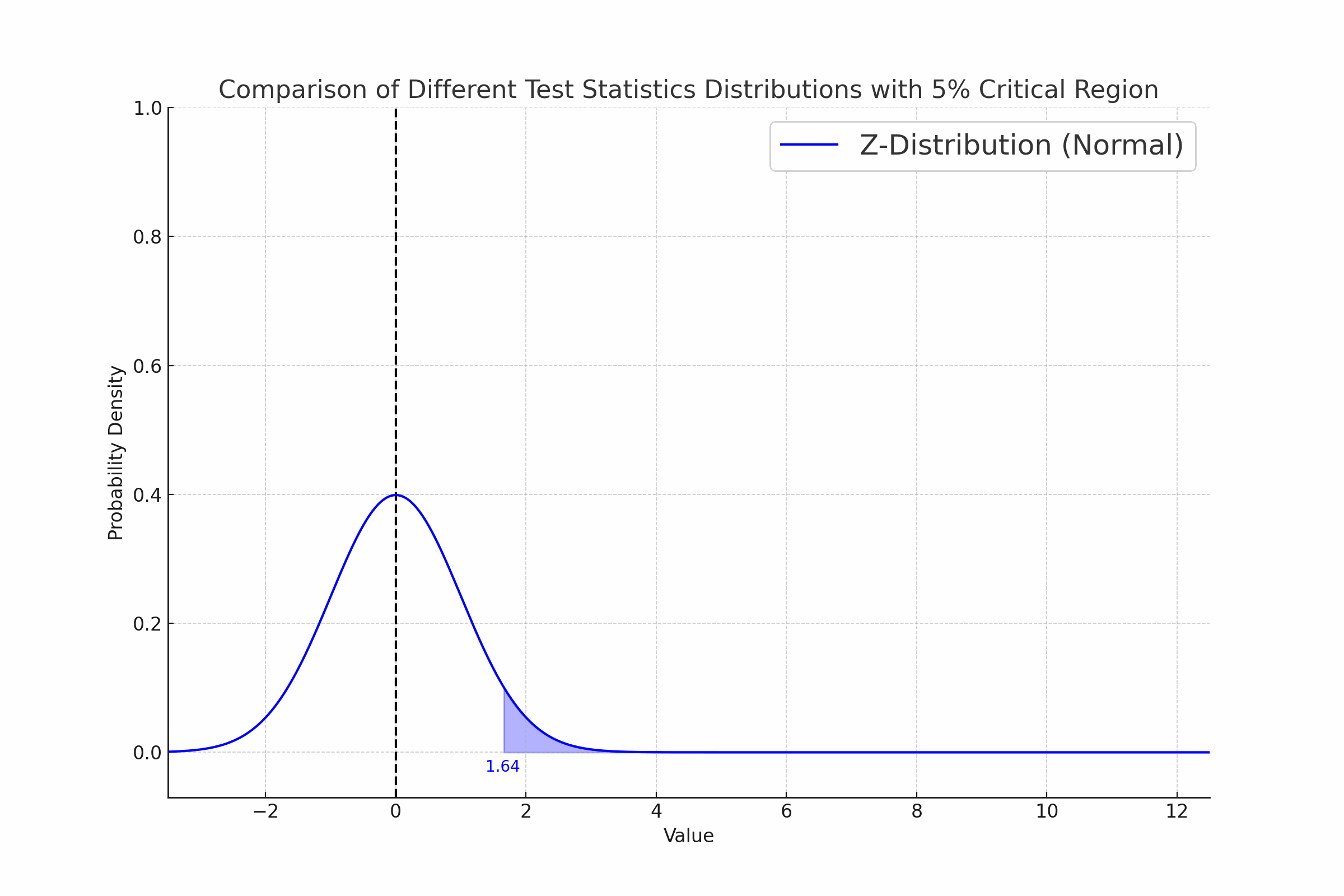 Z통계량(Z-Statistic)은 확률변수입니다. Z통계량의 확률분포는 표준정규분포(Standard Normal Distribution)를 따릅니다. Z통계량은 Z검정(Z-test)에서 사용됩니다. Z검정은 모집단의 표준편차가 알려져 있거나 표본의 크기가 충분히 클 때 모표준편차 대신에 표본표준편차를 사용하여 수행할 수도 있습니다.