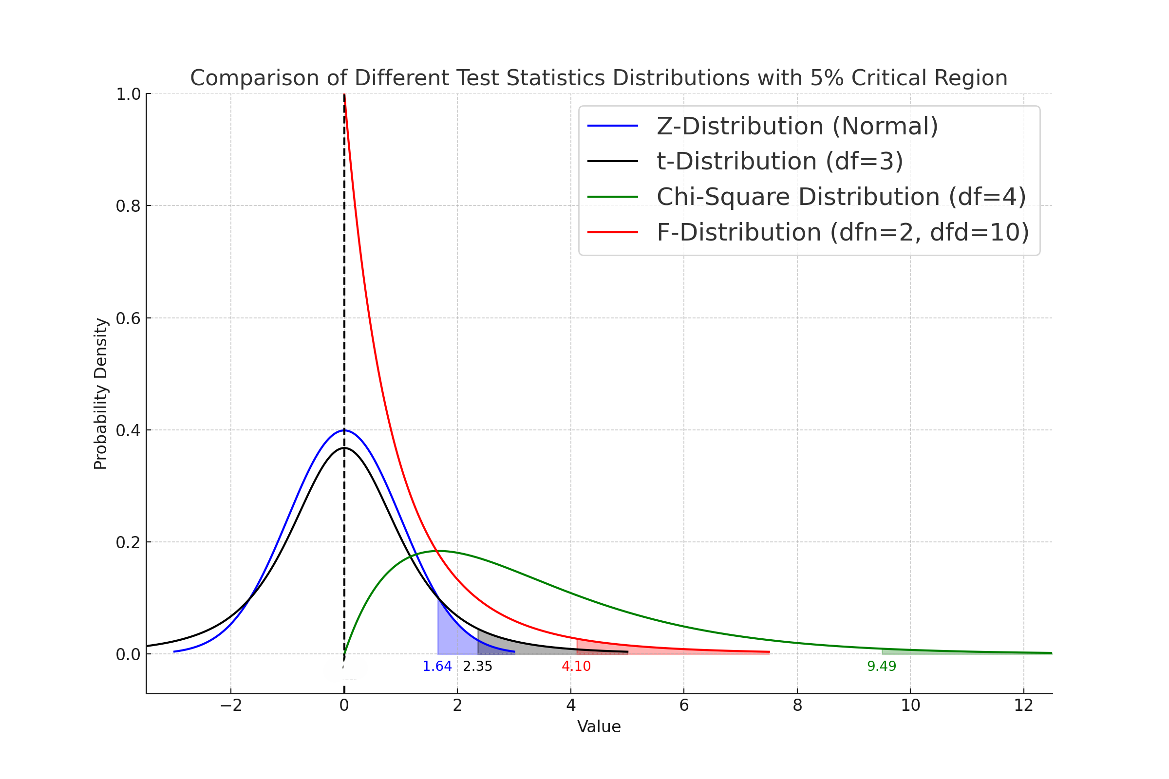 주요 검정통계량으로는 Z통계량, t통계량, 카이제곱통계량, F통계량 등 4종류의 통계량이 있습니다. Z통계량, t통계량, 카이제곱통계량, F통계량, 모두 데이터포인트(Data Point)가 정규분포를 나타낼 때 유도된 통계량입니다. 개체(데이터포인트)의 정규성 가정이 충족될 때, 각 통계량이 따르는 분포인 Z분포, t분포, 카이제곱분포, F분포를 사용할 수 있습니다.