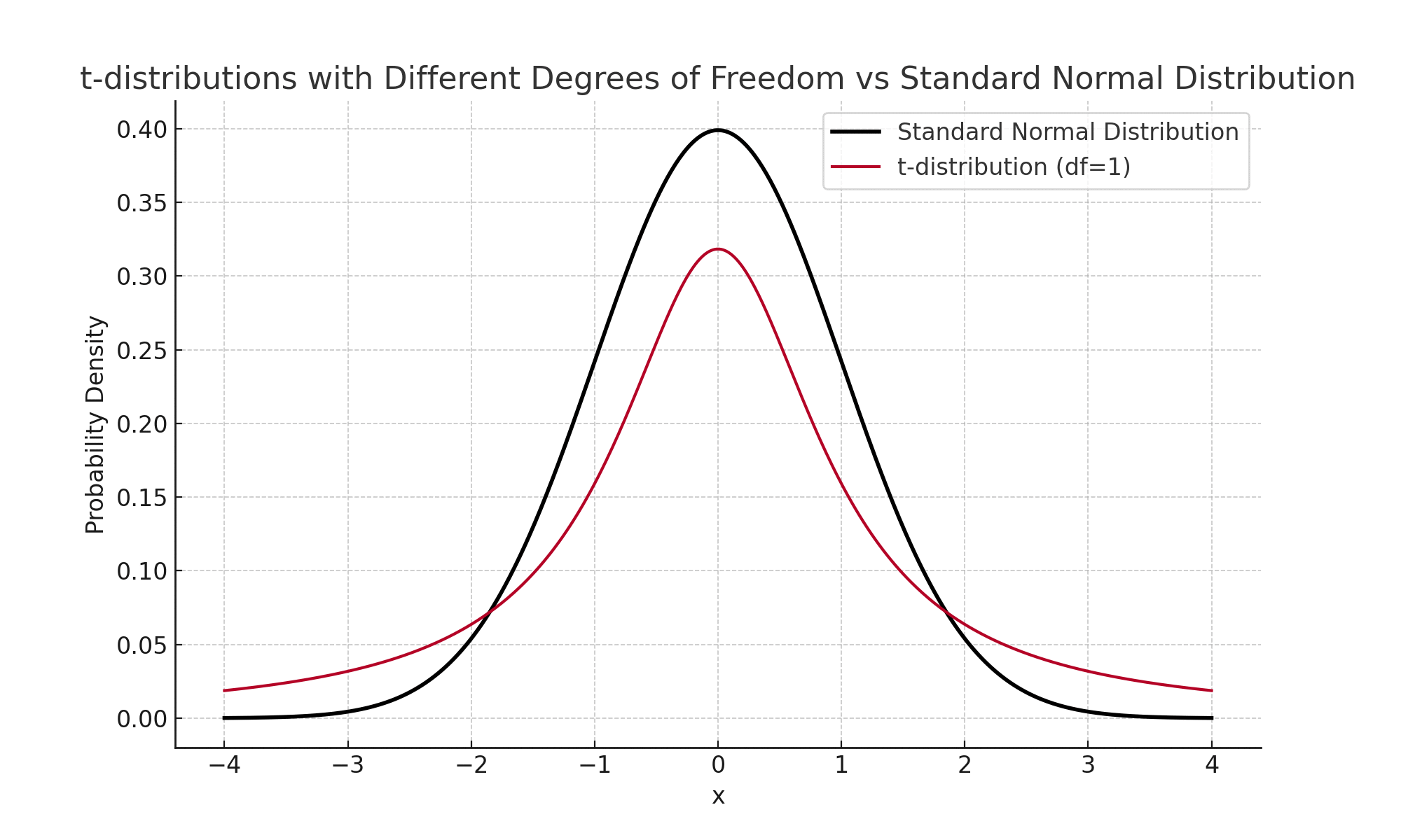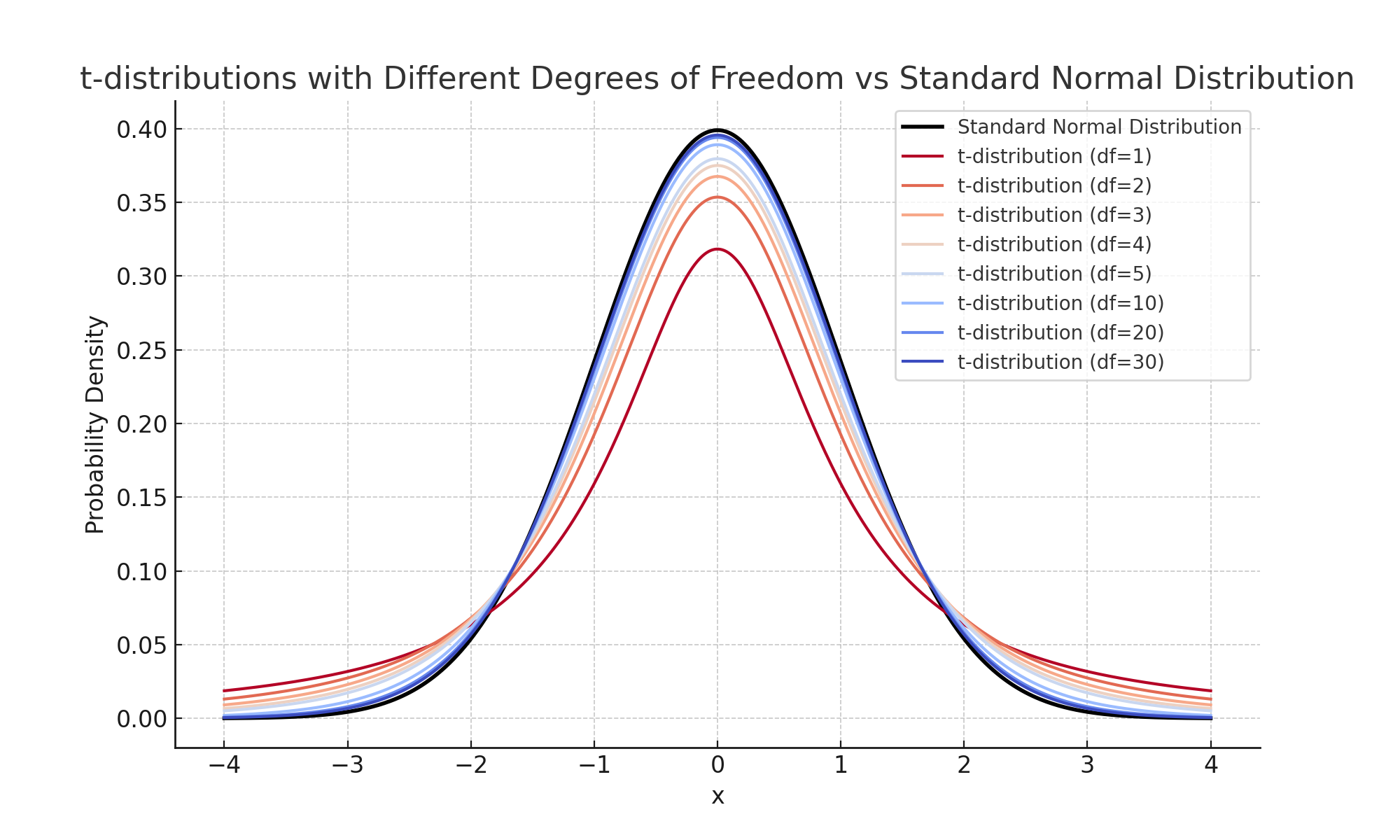 표본크기가 작을수록 t분포는 Z분포보다 꼬리가 두꺼운 형태를 나타냅니다. 이는 자유도가 낮아질수록 표본분산의 불확실성을 반영하려는 보정입니다. 따라서 t검정은 표본분산을 사용할 수밖에 없으며 특히 표본 크기가 작을 때 신뢰성을 확보하려는 방법입니다.