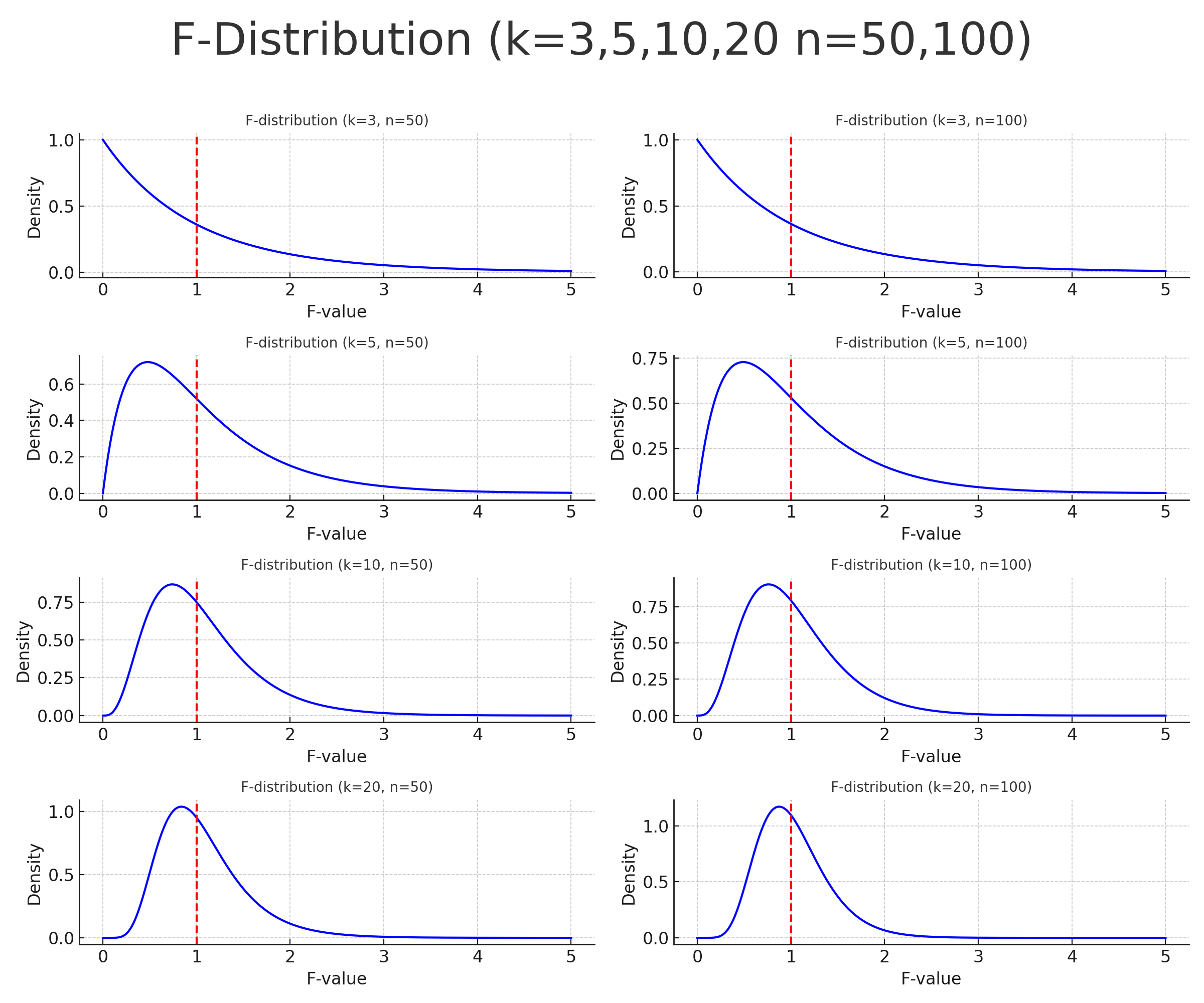 모집단 내의 모든 데이터는 동일한 분산을 가지기 때문에, 집단의 크기가 무한대에 가까워지면 집단 간 분산과 집단 내 분산은 모집단의 분산을 추정하는 동일한 값으로 수렴합니다
