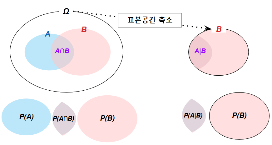 조건부사건에서는 전체 표본공간($\Omega$)이 아니라 전체 표본공간이 축소된 사건 $B$를 표본공간으로 하여 조건부사건에 확률을 부여합니다. 단, 이 떄의 표본공간인 사건 $B$의 확률은 0이 아니어야 합니다.