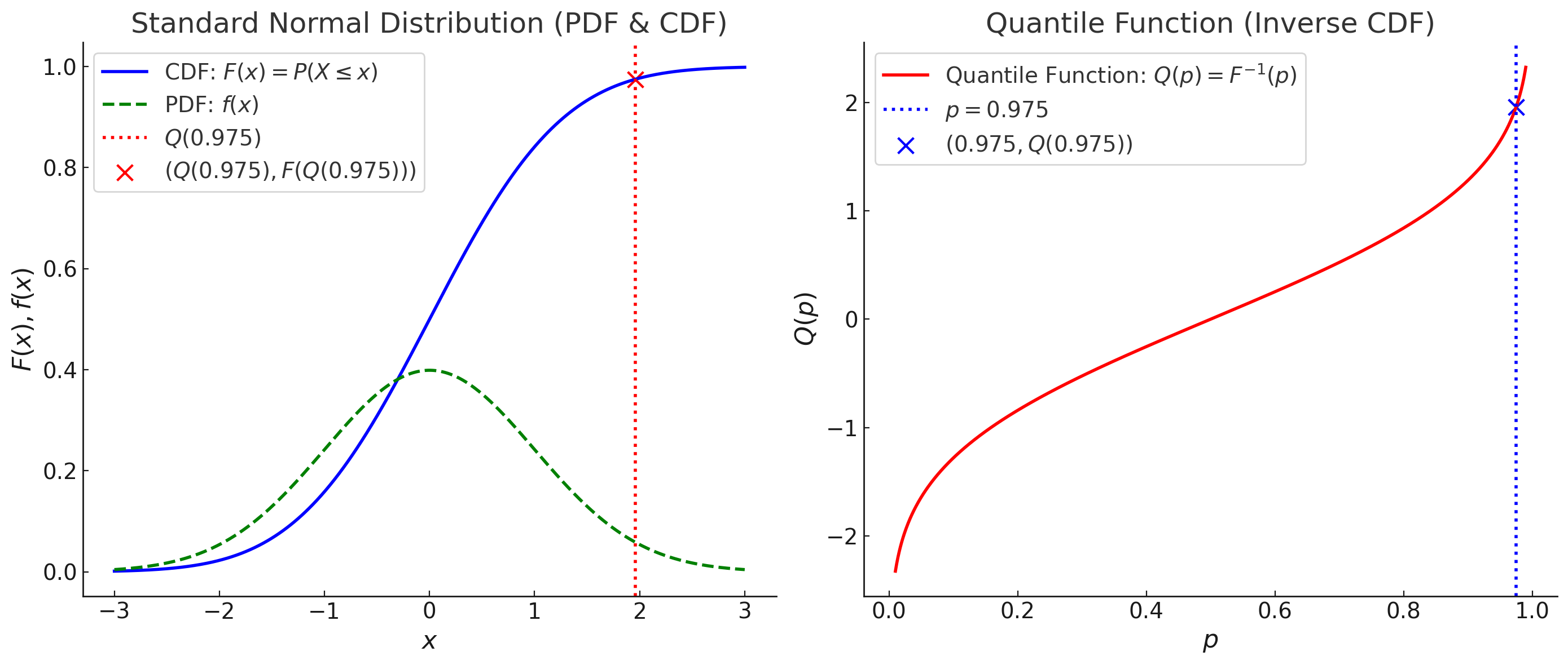 분위수함수($x=Q(p)$)와 누적분포함수($p=F(x)$)는 역함수 관계이며 다음과 같이 표현할 수 있습니다.