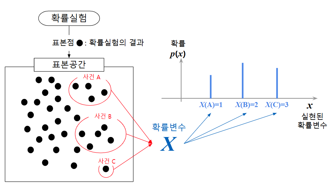 확률변수(random variable)는 확률공간의 표본공간에서 실수공간으로 가는 함수입니다.