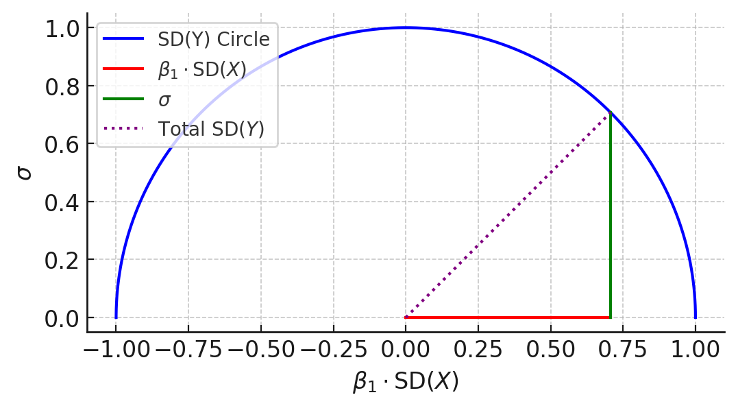 전체 표준편차인 종속변수 $Y$의 표준편차를 고정하면 Fig 1.과 같이 변동성을 반원으로 표현할 수 있습니다.