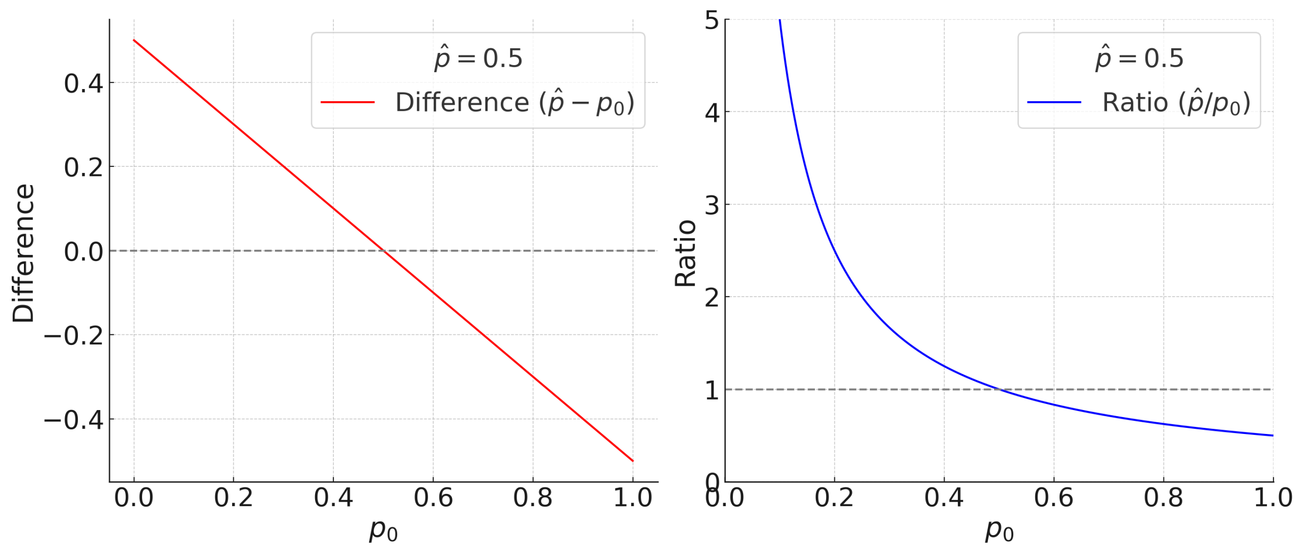 반면, 차이(difference)는 $\hat{p}_1 – \hat{p}_2 = 0$을 기준으로 값이 항상 $-1$에서 $+1$ 사이에 존재하고 대칭적인 분포를 가지며 표준 정규분포로 근사하기 쉽습니다. 수학적으로 보면, 비율(ratio)은 scale-invariant(배율 불변) 특성을 가지지만 검정에서는 location-invariant(위치 불변) 특성이 훨씬 유리합니다. 차이(difference)는 “위치”를 비교하는 것이므로 귀무가설($H_0$)을 “차이 = 0″으로 세우기 쉽고, 안정적입니다.