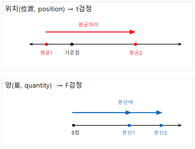 평균은 위치이고 분산은 양이며, 평균의 비교는 t검정으로 분산의 비교는 F검정으로 행합니다.
