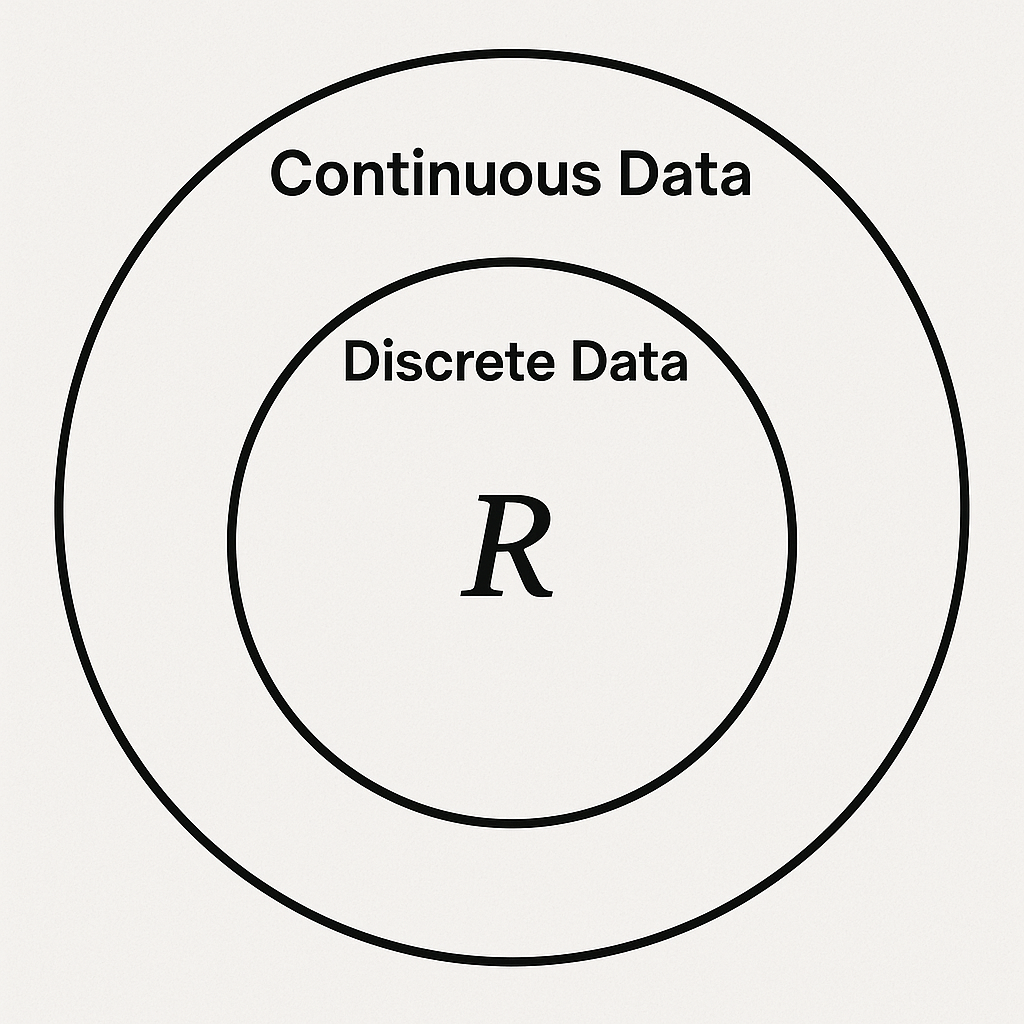 연속형 데이터는 두 값 사이에 무한히 많은 실수 값이 존재하기 때문에, 반드시 실수 체계에서 정의됩니다. 이산형(discrete) 데이터는 일반적으로 정수(integer, ℤ) 또는 유한한 집합의 원소로 정의됩니다. 즉, 값과 값 사이가 끊겨 있고, 두 값 사이에 다른 값이 존재하지 않는 데이터입니다.