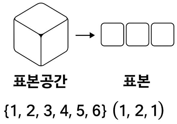 표본(sample)은 표본공간에서 실제로 선택되거나 관측된 결과들의 모음입니다. 이는 확률변수의 실현값들의 모임입니다. 이 실현값은 순서와 중복이 있을 수 있습니다. 따라서 표본은 튜플(tuple)로 표현합니다.