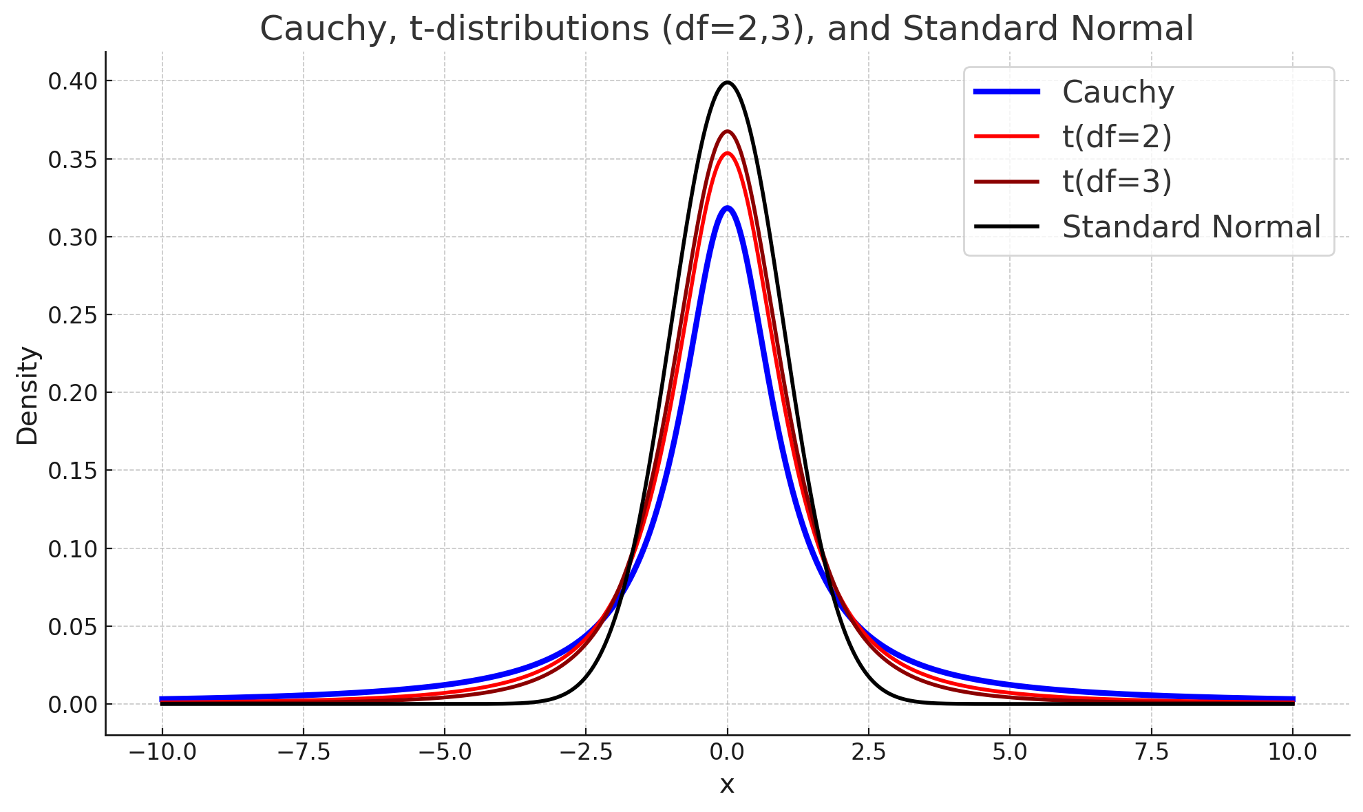 Cauchy 분포는 기대값이 발산하므로 수렴하지 않습니다. 따라서 분산도 계산불가로 존재하지 않습니다. Cauchy 분포의 확률밀도함수와 기대값은 다음과 같습니다.