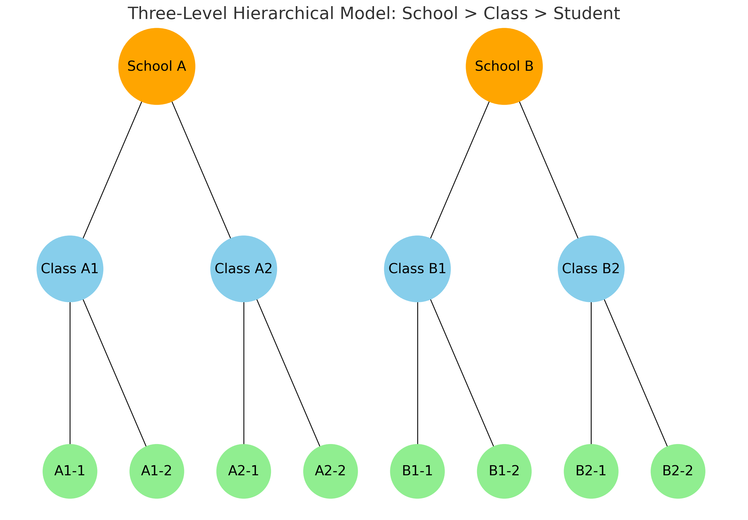 계층구조에서는 전체 변동성을 서로 다른 계층(hierarchy, 수준, level)에서의 변동성으로 분해해서 봅니다. 이를 분산의 계층적 분해 (hierarchical variance decomposition) 라고 합니다.