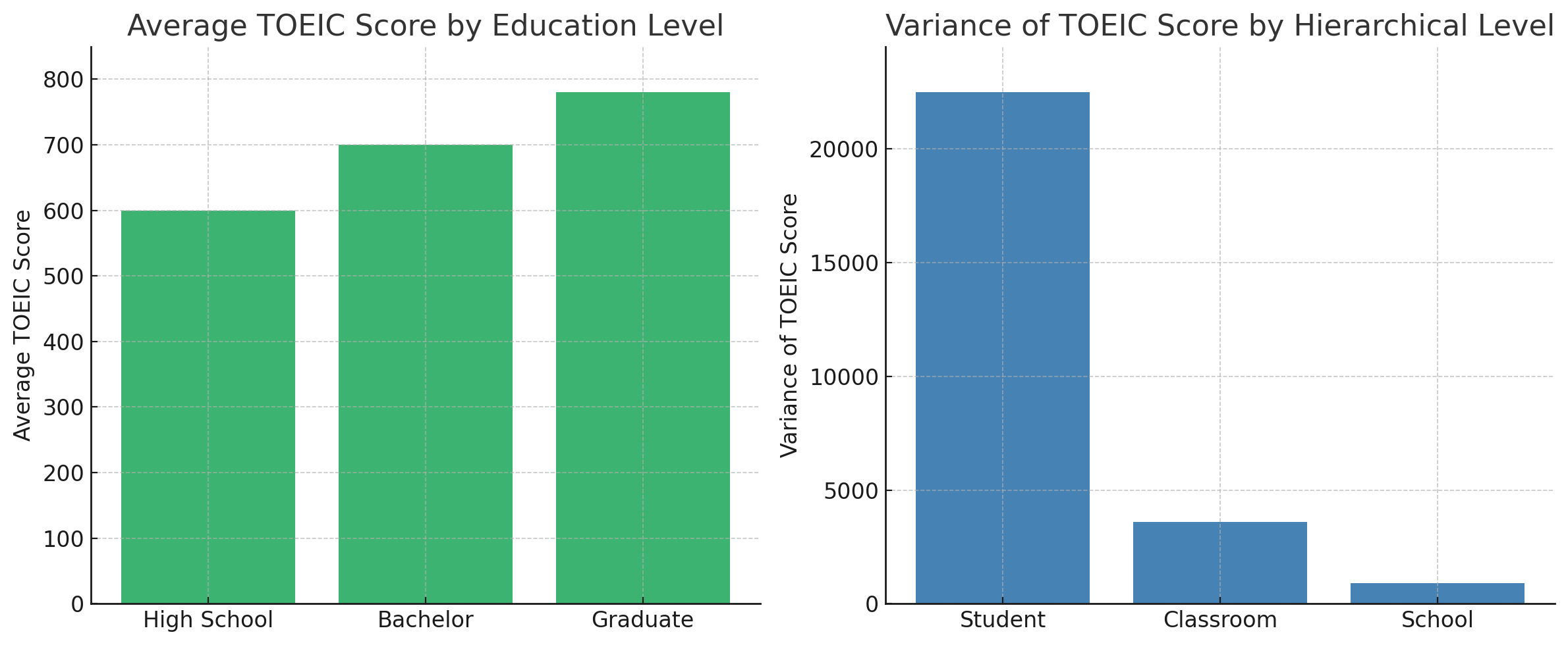 Fig. 1. TOEIC 점수의 교육수준에 따른 평균 비교와 계층수준에 따른 분산 비교