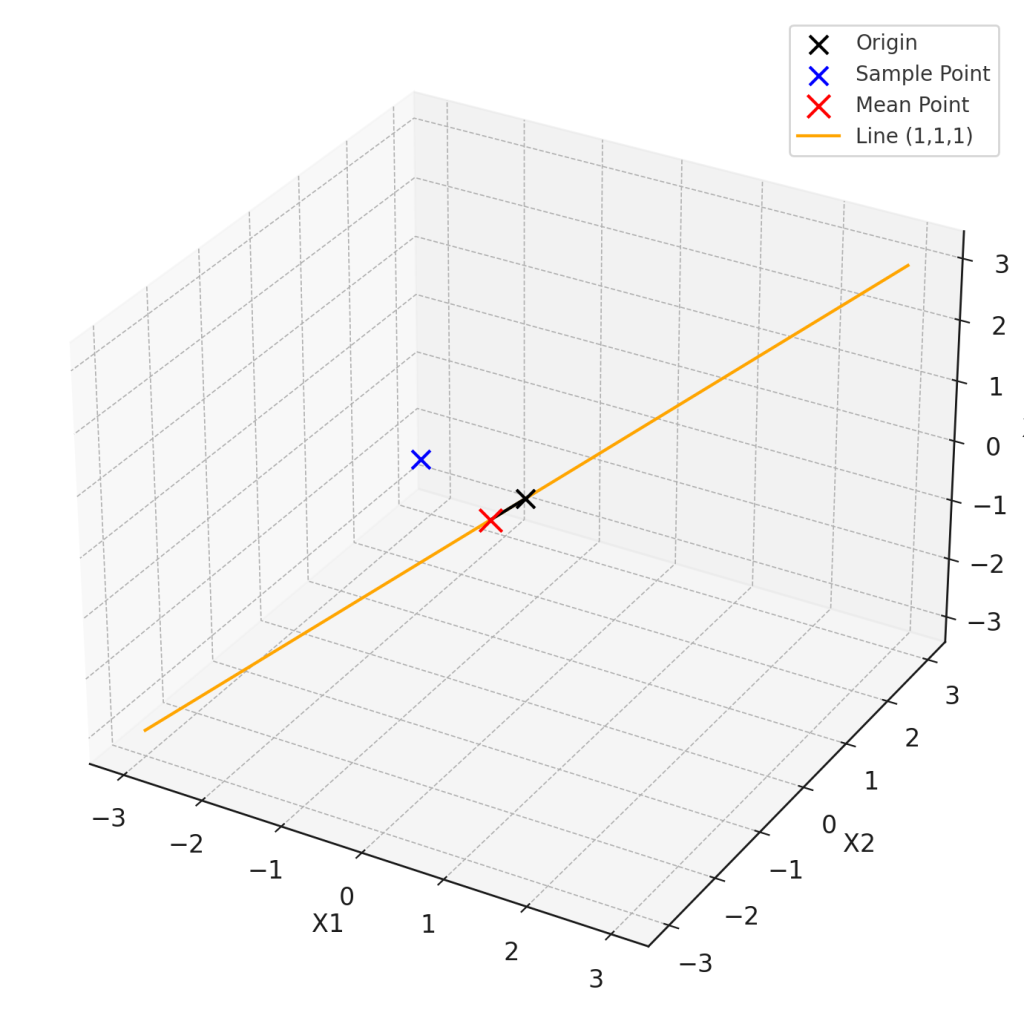 원점에서 평균점까지를 평균벡터로 표현할 수 있습니다. 평균벡터는 모든 성분이 동일하므로