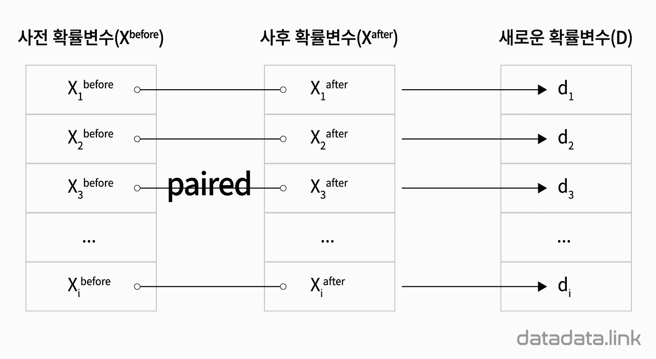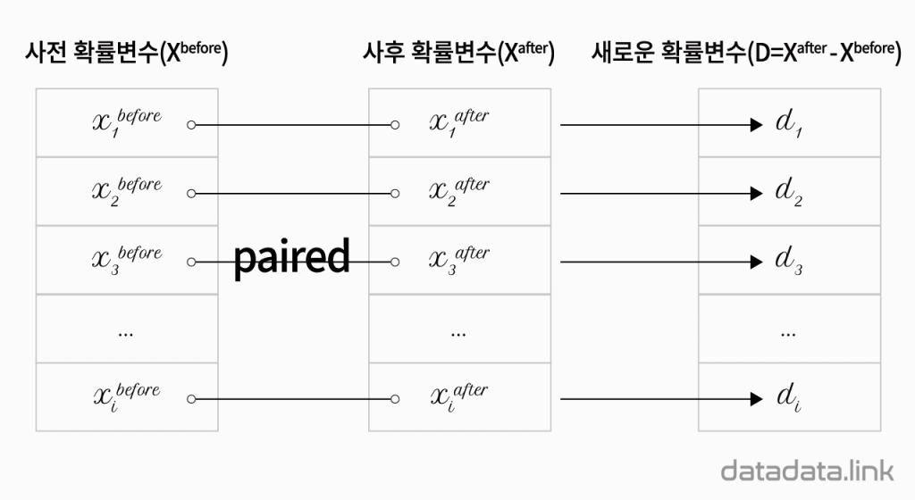 다음과 같이 $n$쌍(pair)의 편차($y_{i2}-y_{i1}=d_{i}$)가 새로운 확률변수($D$ 또는 $d_i$로 표현)가 됩니다.