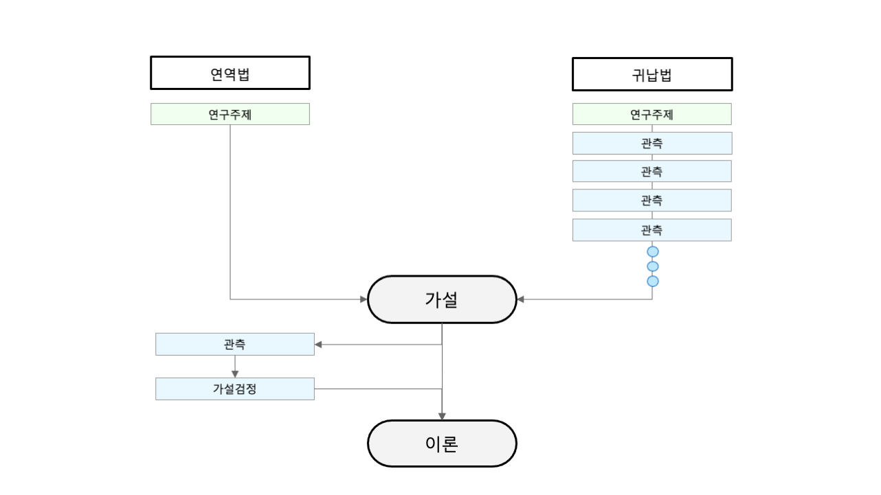 연역법은 가설에 따른 실험을 관측하여 가설을 검정합니다. 검정된 가설은 이론이 됩니다. 귀납법은 연구주제를 다각적으로 관측하여 가설을 만들고 가설은 점차 이론이 됩니다.